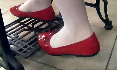 Pretty brunette female Petra wears red flats while working with sewing machine