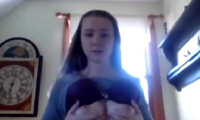 Curly haired brunette flashes and plays with her xxl titties on cam