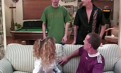Skinny and sultry girl in ponytails stars in a sexy gangbang