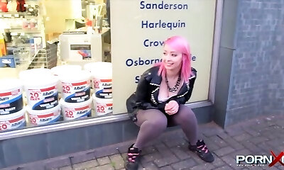 Nasty pink haired emo girlie in tight yoga pants urinates outdoors for dude