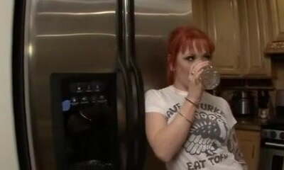 Tattooed redhead Misti Dawn tongues his hotdog