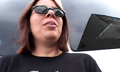 Fleshy babe shows her yummy booty in public and rides Nick Moreno's trunk indoor