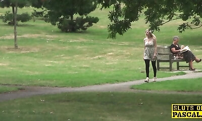 Amateur teen gal Bella unveils her jugs and pussy in the park teasing her bf
